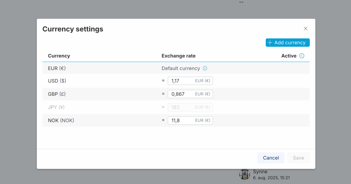 Currencies and exchange rates are now managed directly from the financial library, streamlining your workflow across different markets.