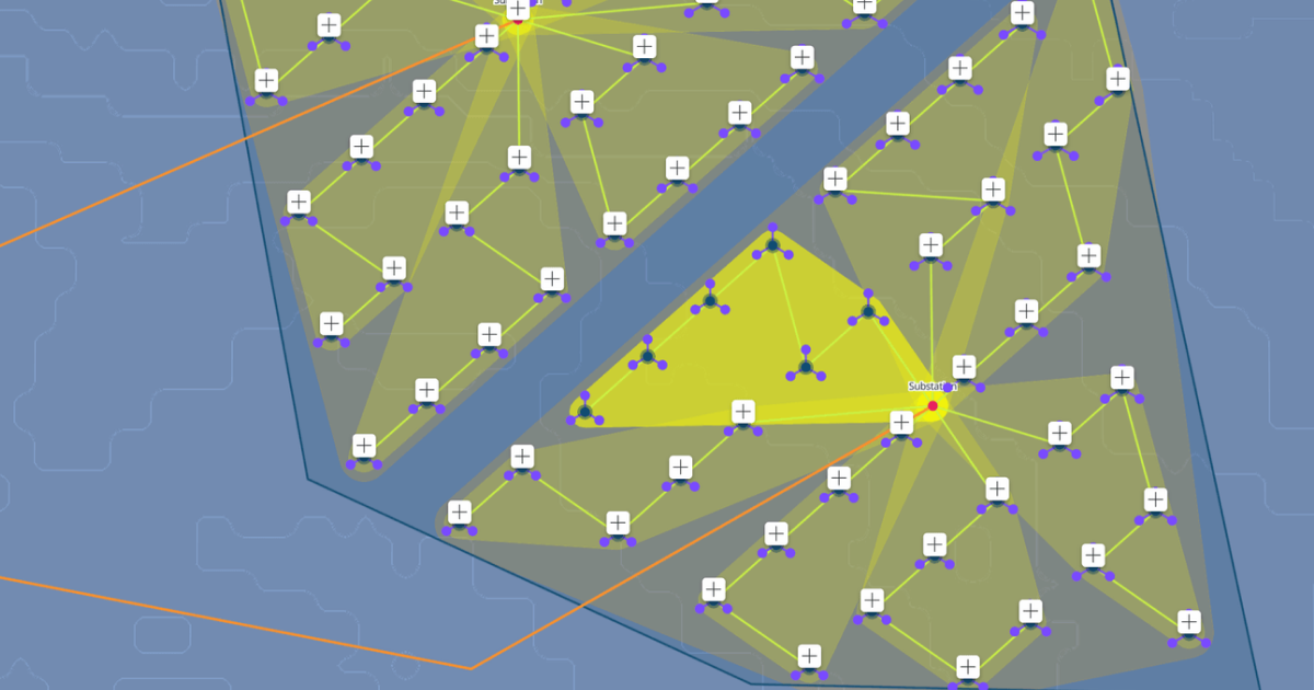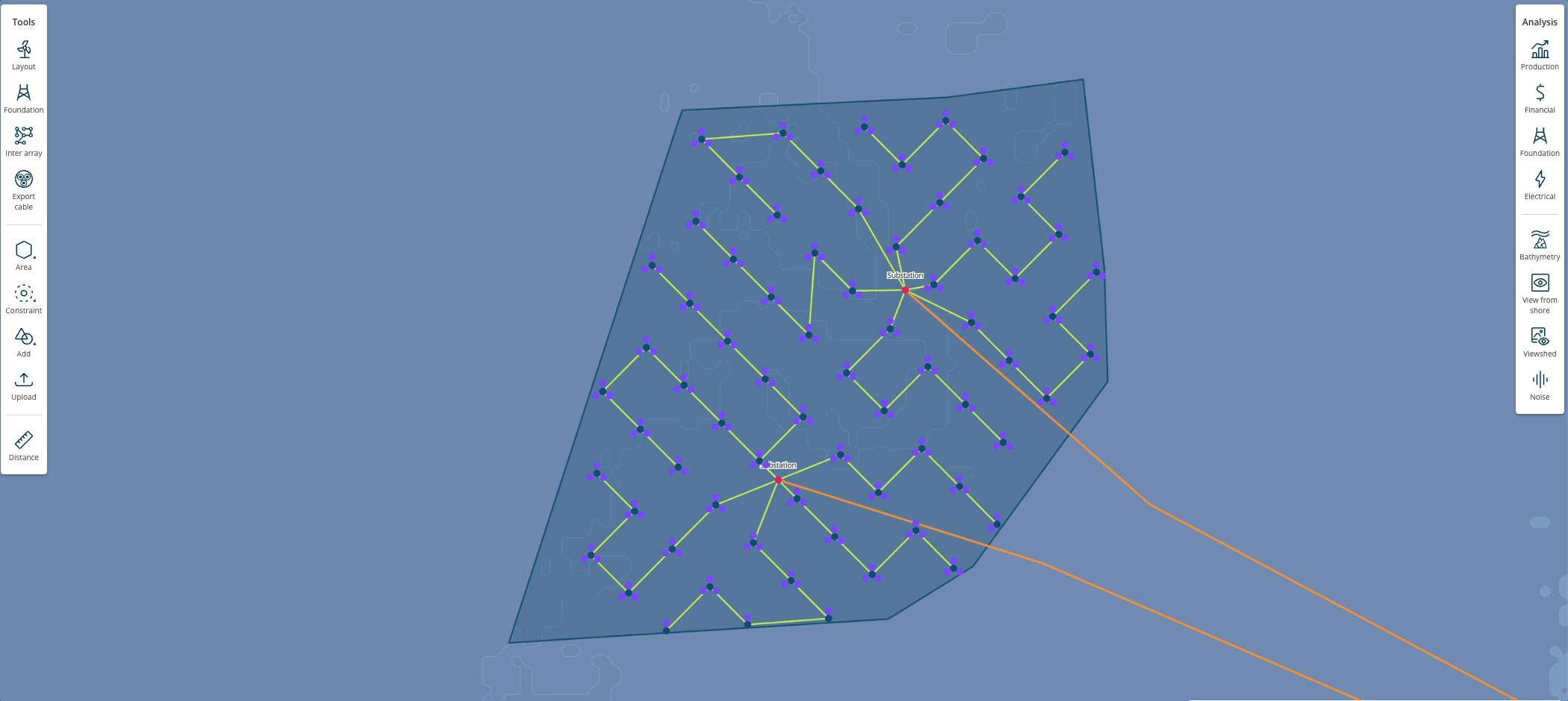 Generate initial inter array layout designs in seconds with our built-in optimisation tool to minimise total cable length, automatically considering exclusion zones, turbines, road networks and other park structures. For offshore wind parks, you can optimise substation placement in-the-loop to minimise cable lengths and save costs.